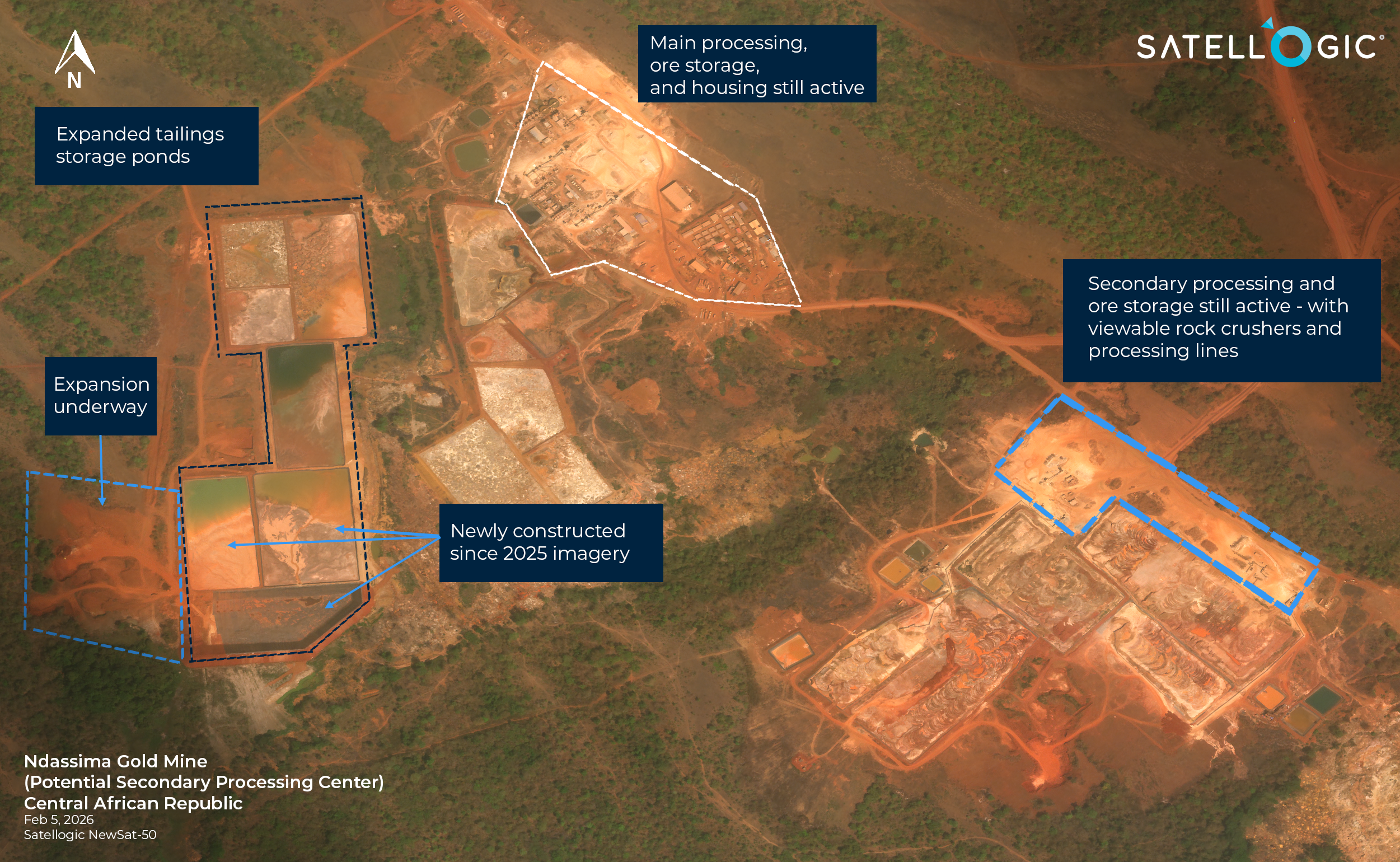 Satellite imagery from February 5, 2026, reveals that Ndassima’s waste-management footprint has expanded significantly since 2025, with newly constructed tailings storage ponds visible adjacent to earlier infrastructure.